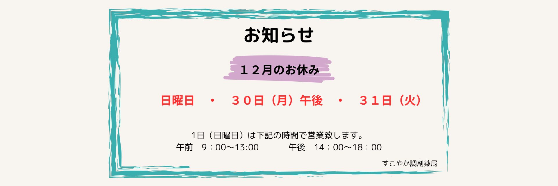 こんにちは。三潴郡大木町にあります「すこやか調剤薬局」です。 12月お休みのお知らせです。 日曜日・30日(月)午後・31日(火) 1日(日)は下記の時間で営業致します 午前 9:00~13:00 午後 14:00~18:00 宜しくい願い致します。