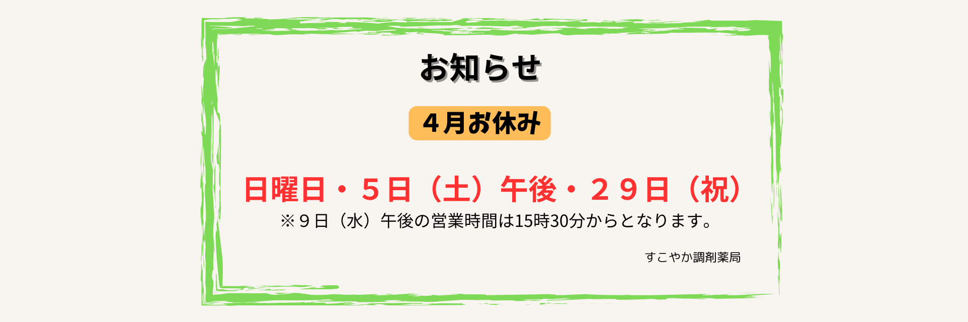 こんにちは。三潴郡大木町にあります「すこやか調剤薬局」です。 4月お休みのお知らせです。 日曜日・5日(土)午後・29日(祝) 9日(水)の午後営業は15時30分からとなります。 宜しくお願い致します。